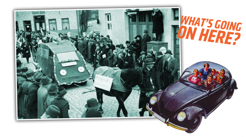 “Meanwhile impatient customers of the new Volkswagen had organised a street parade sometime in February 1939. The horse is pulling what appears to be a mock-up of the VW.”
