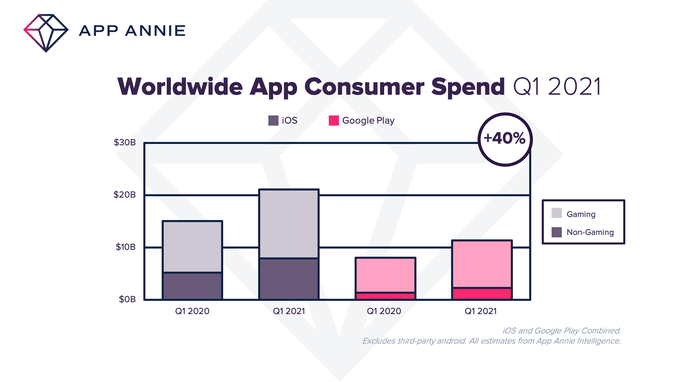 Big news for the app economy this week, as App Annie reported that consumer spending on mobile apps broke a new record.According to new data, worldwide consumers in Q1 2021 spent $32 billion on apps across both iOS and Google Play, up 40% year-over-year from Q1 2020. It’s the largest-ever quarter on record, with mobile consumers spending roughly $9 billion more in Q1 2021 compared with Q1 2020, in part due to the pandemic’s continued impacts.