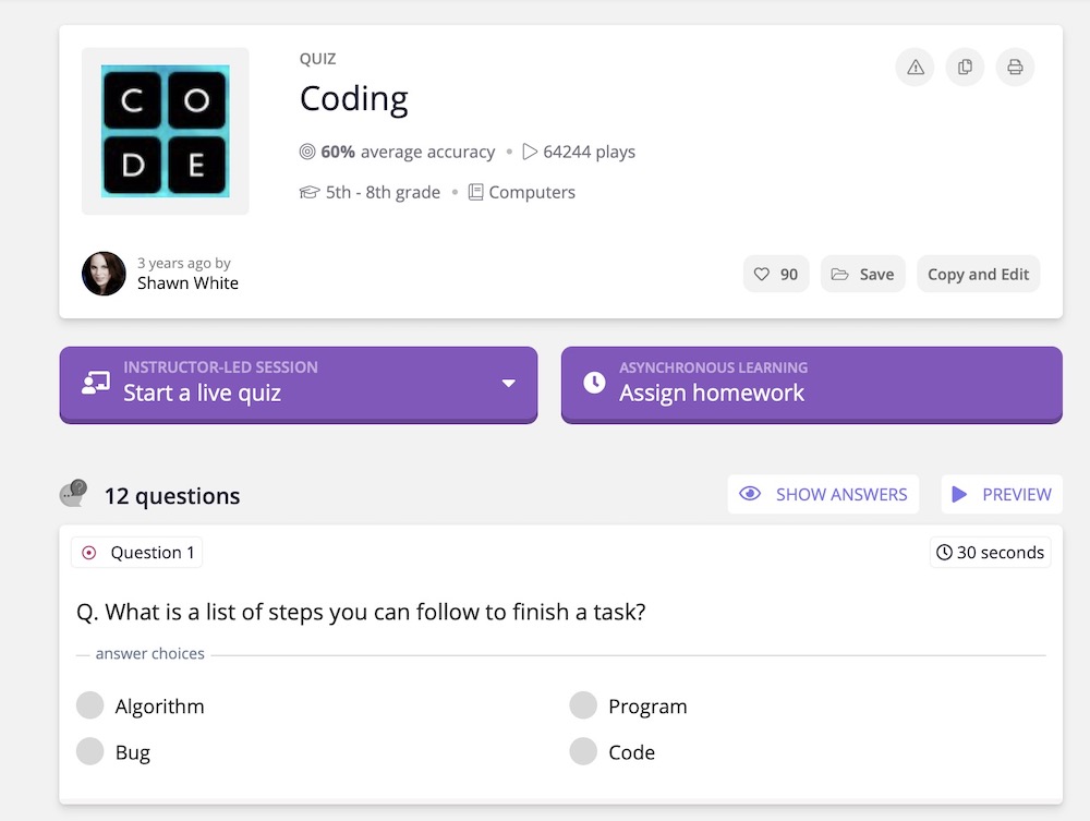 On Quizizz, teachers and the community develop gamified lessons for students. (Teachers don’t have to build these lessons. For the concepts that they want to explain to students, if lessons exist, many just use those instead. The platform has over 20 million quizzes today.)