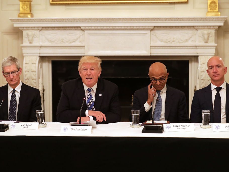 U.S. President Donald Trump (2nd L) welcomes members of his American Technology Council, including (L-R) Apple CEO Tim Cook, Microsoft CEO Satya Nadella and Amazon CEO Jeff Bezos in the State Dining Room of the White House June 19, 2017 in Washington, DC.Chip Somodevilla/Getty