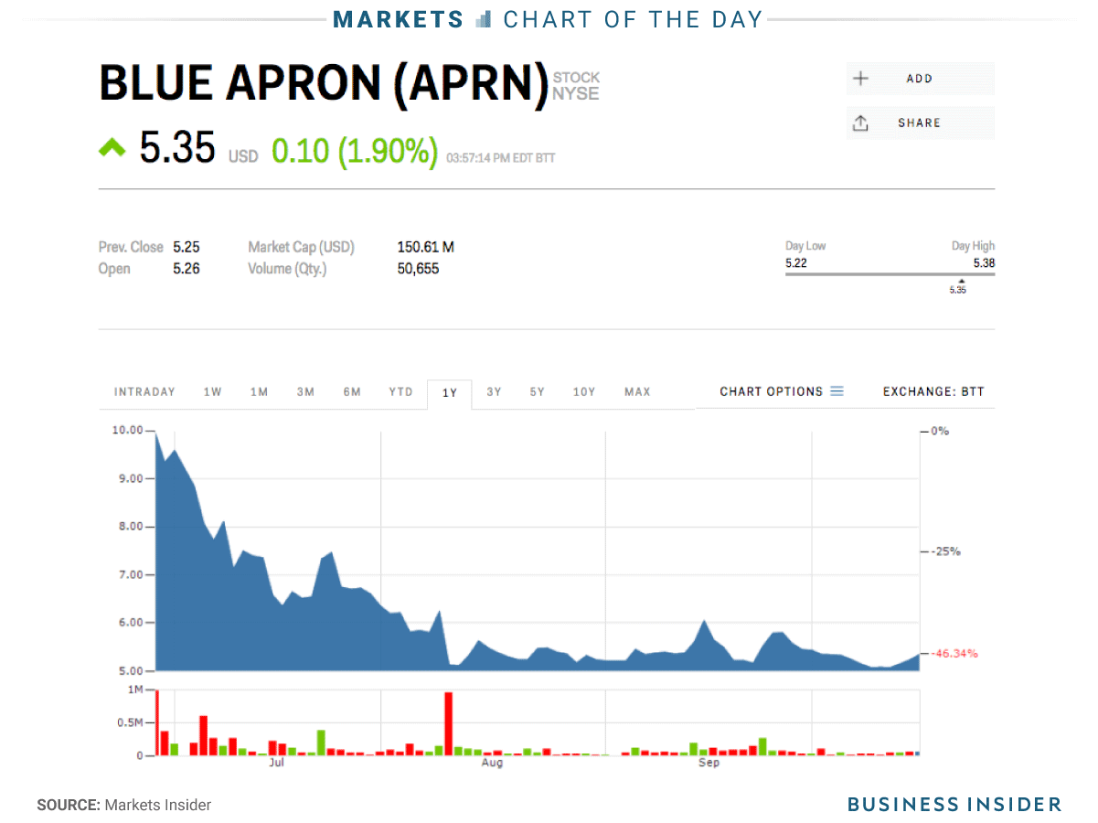 Amid all of this fervor in the industry, it’s looking like traders think no price is too low for Blue Apron’s flailing stock. The company’s shares rose 0.2% to $5.26 at 1:49 p.m. ET on Tuesday.