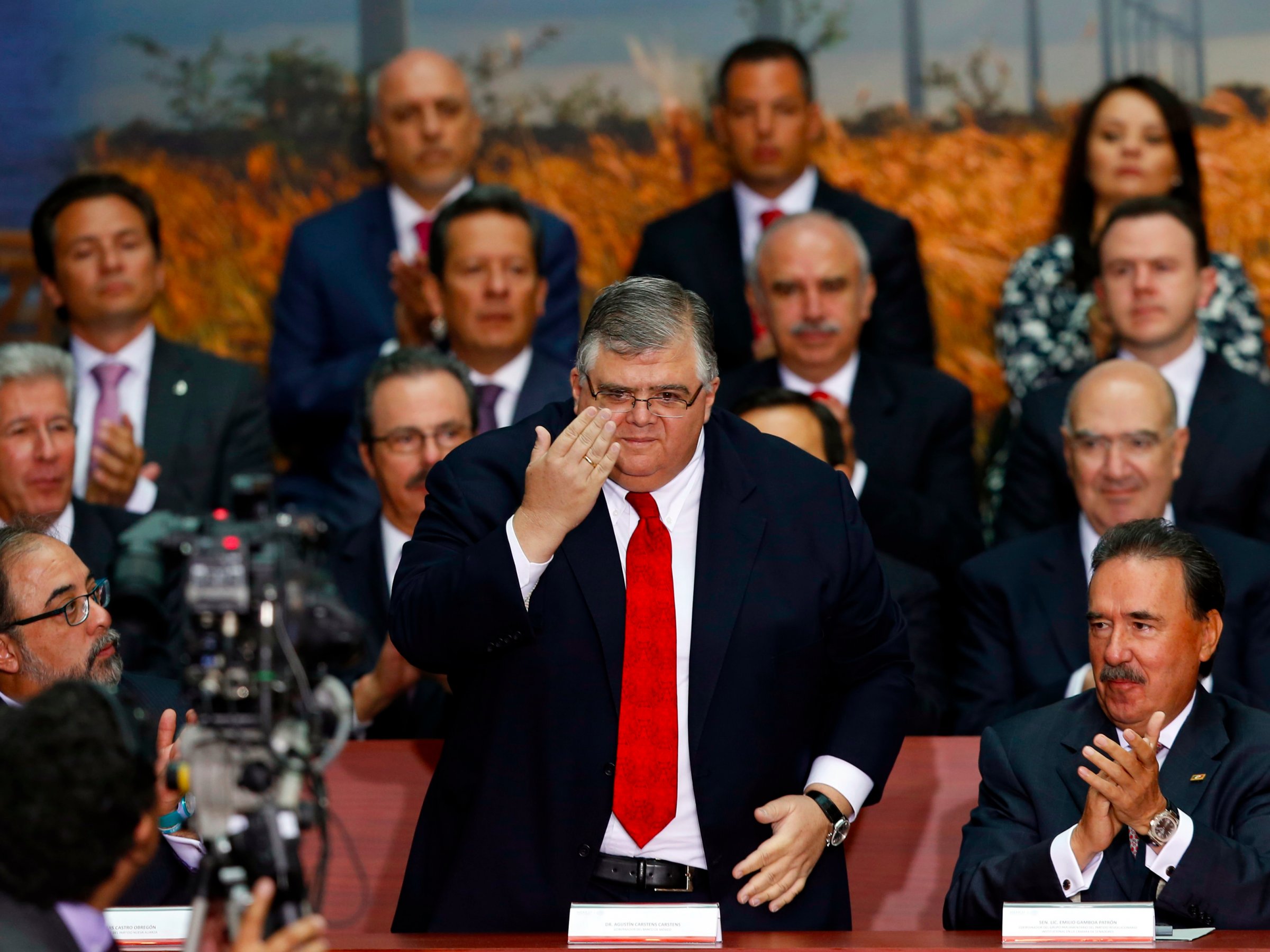 Mexico’s Central Bank Governor Agustin Carstens (C) greets the audience at the National Palace in Mexico City August 11, 2014.REUTERS/Edgard Garrido