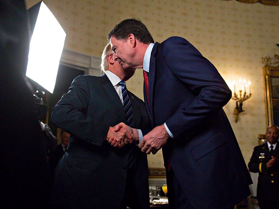 U.S. President Donald Trump (L) shakes hands with James Comey, director of the Federal Bureau of Investigation (FBI), during an Inaugural Law Enforcement Officers and First Responders Reception in the Blue Room of the White House.Andrew Harrer-Pool/Getty Images