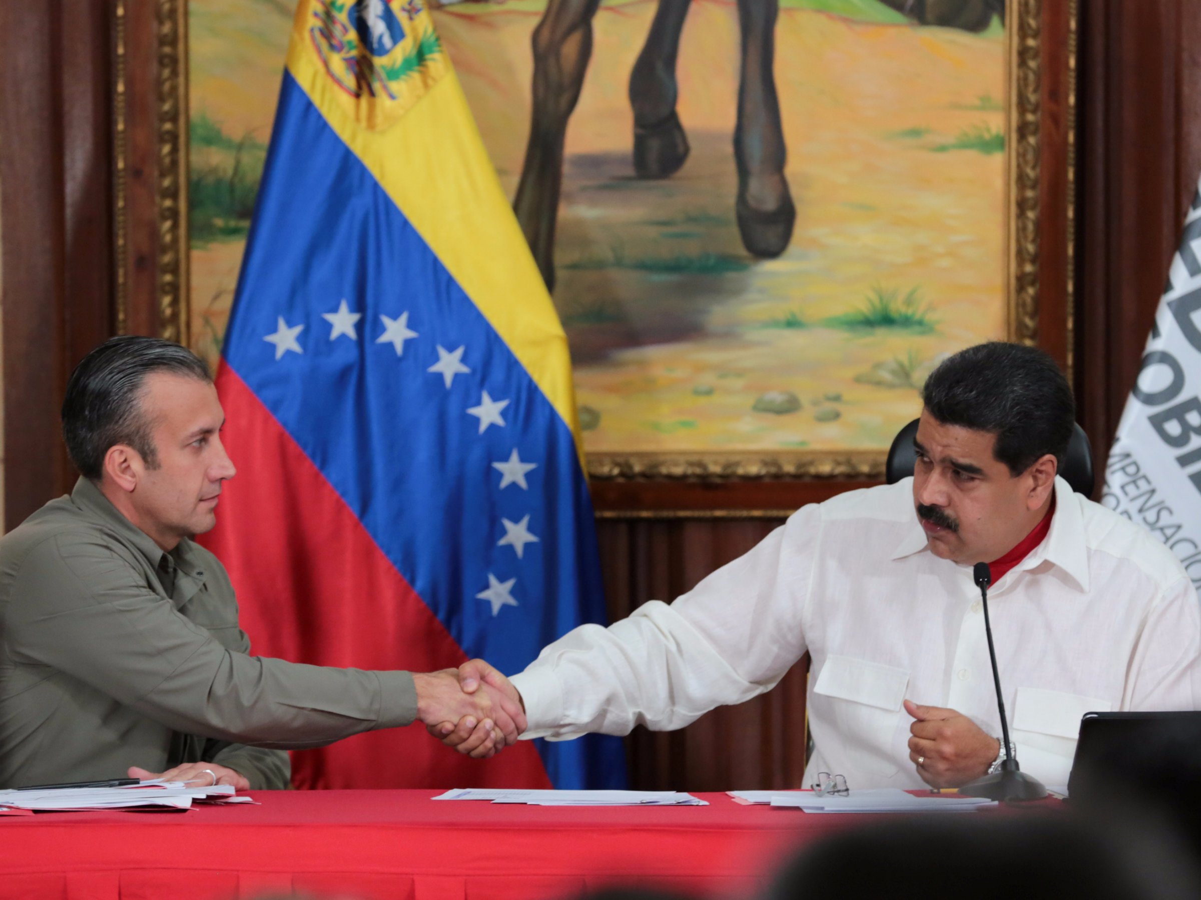 Venezuela’s President Nicolas Maduro, right, and Venezuela’s Vice President Tareck El Aissami, shake hands during a meeting with governors in Caracas, Venezuela, February 14, 2017.Miraflores Palace/Handout via REUTERS