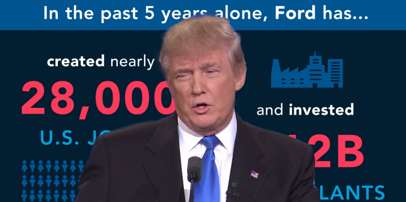 Barely a week after his election and two months from even taking office, President-elect Donald J. Trump is already making America great again by keeping American jobs in America. You know it’s true because he told us so on Twitter! There tonight, Trump bragged of negotiating with Ford to keep a Lincoln plant from moving from Kentucky to Mexico. Problem is, he’s full of shit, as always. These plants—there’s two of them—were never going to Mexico.