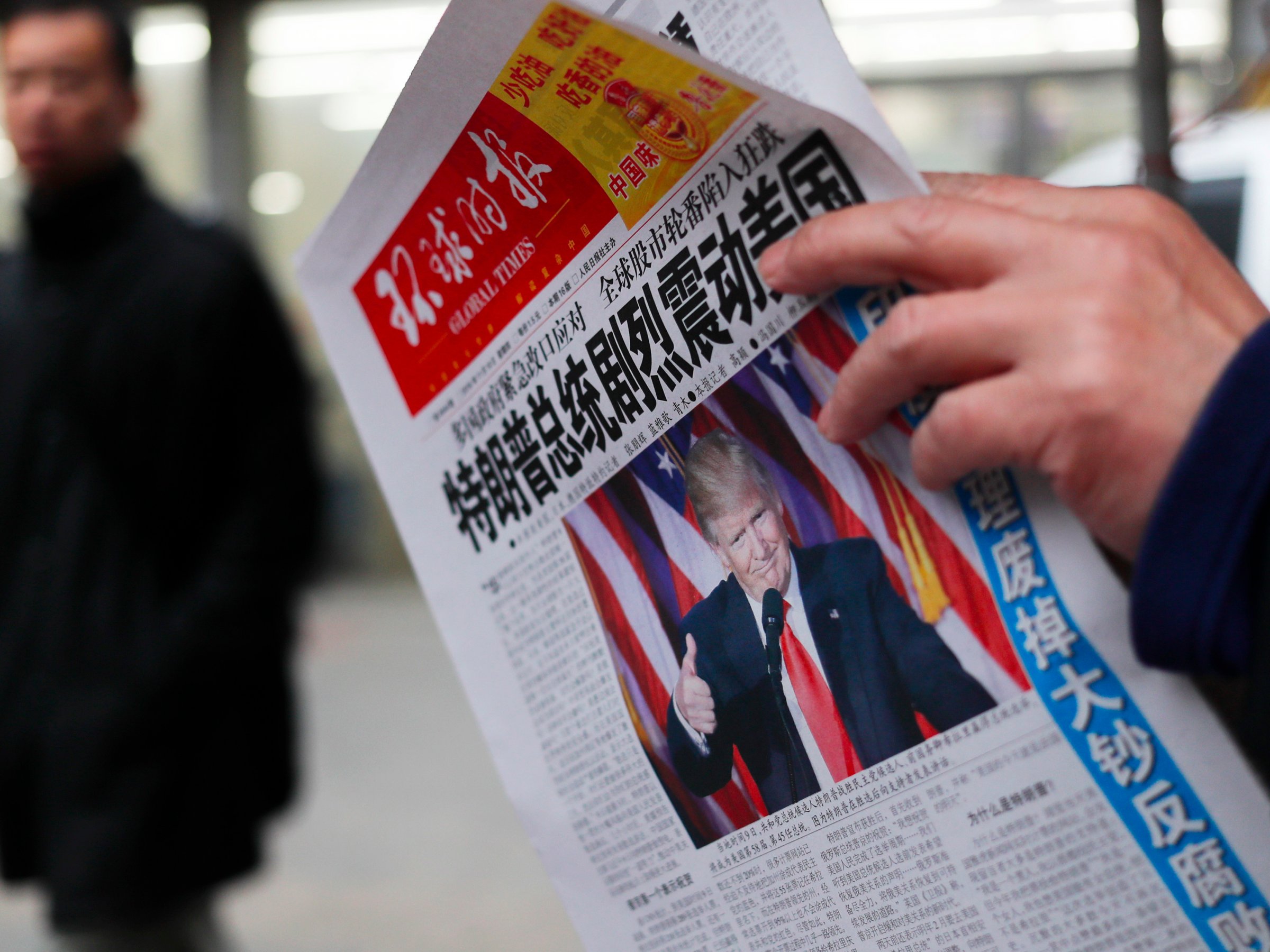 A man at a newsstand in Beijing on November 10 reading a newspaper with the headline of “US President-elect Donald Trump delivers a mighty shock to America.”Andy Wong/AP