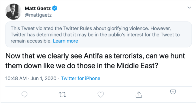 “We have placed a public interest notice on this Tweet from @mattgaetz,” a Twitter spokesperson told TechCrunch, linking its platform policy page. Twitter users can still share the tweet with comment, but regular retweets, likes and replies have been deactivated.