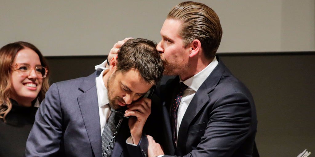 Agents celebrate after buying the auction of Leonardo da Vinci’s ‘Salvator Mundi’ during the Post-War and Contemporary Art evening sale at Christie’s on November 15, 2017 in New York City.Eduardo Munoz Alvarez/Getty Images