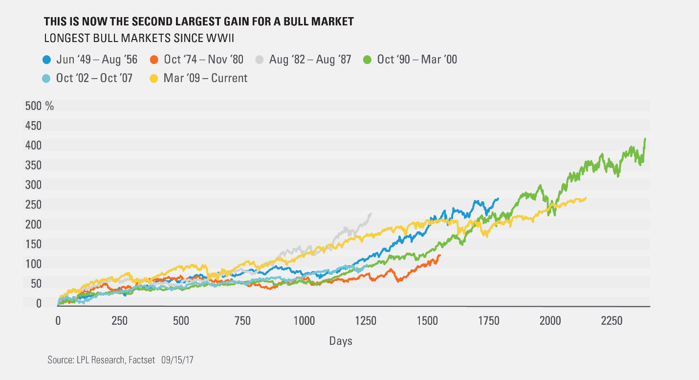The S&P 500 Index’s current bull market became the second best performing in the modern economic era on Monday. Stocks have climbed by about 270% from their March 2009 low over the last eight years, according to data from LPL Financial.