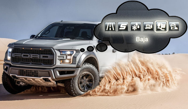 Behold the beast mode: “Baja” puts the Raptor’s throttle response at its most direct setting, holds the RPMs as high as safely possible to squeeze every drop of energy out of the turbocharged 3.5-liter V6 EcoBoost engine and relaxes the traction/stability systems to allow for the most yaw and slide it deems safely possible.