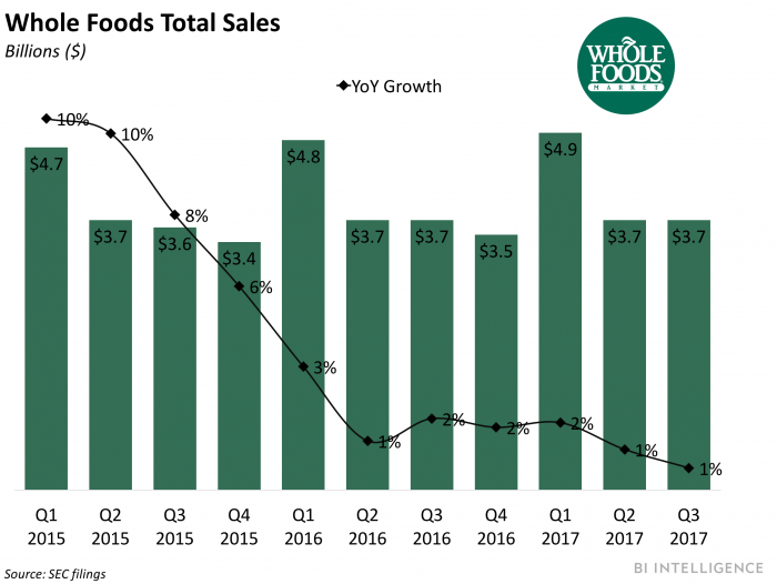 This means focusing on Whole Foods’ performance online may bear more fruit than in-store efforts. Whole Foods saw foot traffic jump right after the acquisition, but inMarket projects the statistic landed at 4% below average in September, so Amazon won’t immediately be fixing Whole Foods’ falling sales with in-store improvement. These newfound online sales, on the other hand, could pull Whole Foods’ performance up as Amazon provides it with more exposure and a much larger reach.