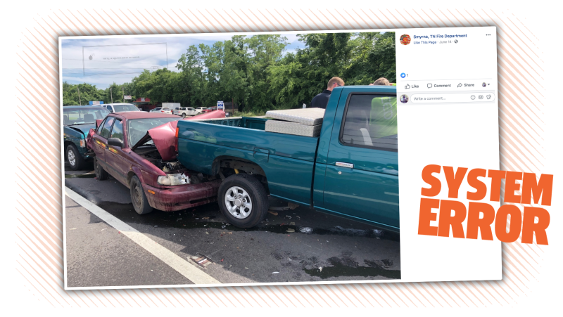 We did some digging, and according to a post from the Smyrna, Tennessee Fire Department, it looks like this wreck was just a teal Hardbody bread/maroon Sentra meat sandwich: