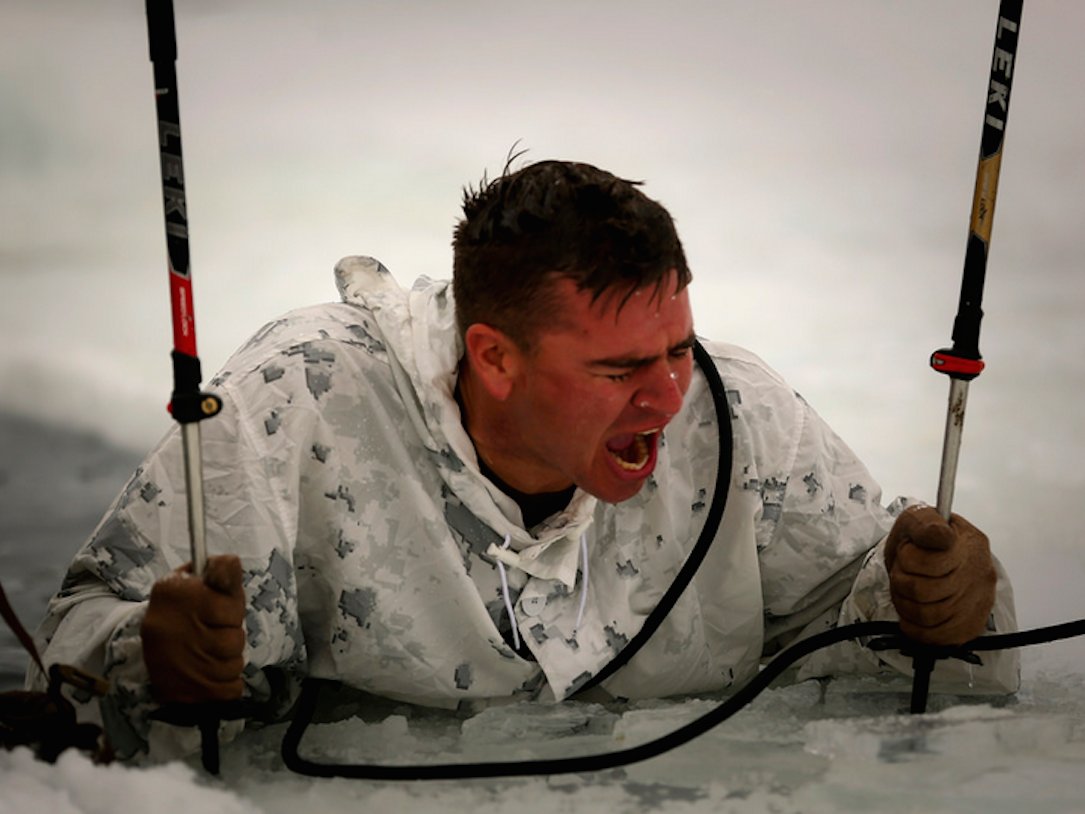 Scream the Hymn Staff Sgt. John Freeseha, instructor and instructor with the Animal Packers Course, begins singing the Marine’s Hymn after completing a plunge into freezing water during an Ice-Breaker Drill as part of Winter Mountain Leaders Course 1-15 at Levitt Lake, Marine Corps Mountain Warfare Training Center, Bridgeport, California, Jan. 30, 2015. It was the first time in approximately three years since the drill was conducted at MCMWTC.Flickr/Marines