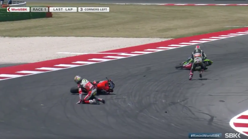The FIM Superbike World Championship race was in its final corners Saturday when leader Chaz Davies wrecked and fell off of his bike. The rider racing for second was right behind Davies, and didn’t have time to avoid running over him as he crashed. A local hospital diagnosed Davies with multiple injuries.